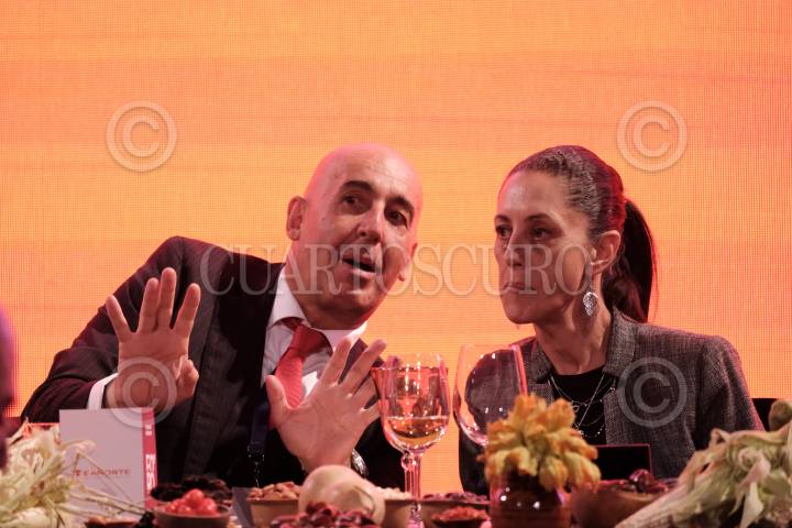 CIUDAD DE MÉXICO, 20AGOSTO2019.- José Antonio Murillo Garza, director General adjunto de analítica grupo Financiero Banorte, y Claudia Sheinbaum, jefa de Gobierno, durante el "Foro de Estrategias Banorte 2019, el reto social de la banca", el cual se realizó en el Palacio de Minería. FOTO: GRACIELA LÓPEZ /CUARTOSCURO.COM