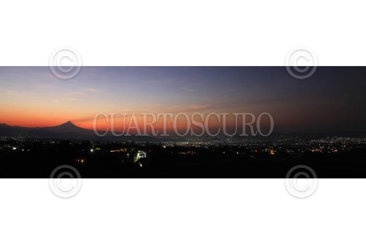 El volcán Popocatépetl emite una fumarola de gases y ceniza que se dirige al suroeste al amanecer de este día, imagen tomada desde la ciudad de Cuernavaca.