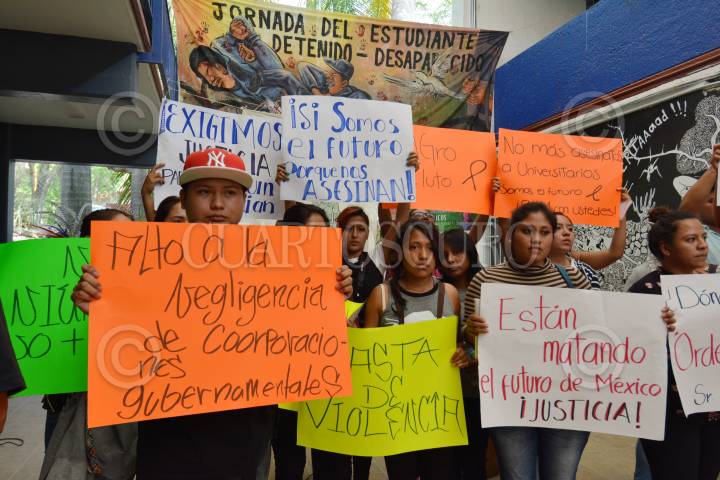 CHILPANCINGO, GUERRERO.26MAYO2017.- Por segundo día estudiantes y maestros de la Escuela Superior de Arte de la Universidad Autónoma de Guerrero,, volvieron a salir a las calles para exigir justicia de su compañero Darwin Raymundo Barrientos Miranda quien cursaba el tercer año en la Escuela Superior de Arte y que fue asesinado el pasado 24 de mayo. Además los estudiantes exigieron el esclarecimiento de este y otros crines en contra de universitarios. FOTO: JOSÉ I. HERNÁNDEZ / CUARTOSCURO.COM