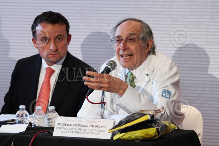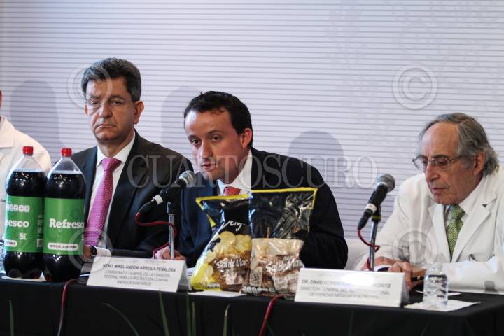 MÉXICO, D.F., 30JUNIO2015.- Mtro. Mikel Andoni Arriola Peñalosa, comisionado federal para la protección contra riesgos sanitarios; y el Dr. David Kershenobich Stalnukowitz, director general del Instituto Nacional de Ciencias Médicas y Nutrición. Durante la conferencia que ofreció la COFEPRIS y la Secretaria de Salud, para anunciar el inicio de la vigencia del nuevo etiquetado frontal para alimentos y bebidas no alcohólicas preenvasadas. Estas etiquetas mencionan los especialistas, son de fácil entendimiento para la sociedad, permitirá la comparación de productos con base en un valor calorico, y es un componente fundamental para la prevención y control de sobrepeso. FOTO: ISABEL MATEOS /CUARTOSCURO.COM