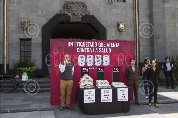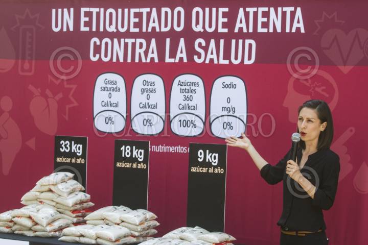 CIUDAD DE MÉXICO, 28MARZO2017.- Fiorella Espinosa, Coordinadora de investigación de El Poder del Consumidor, durante una acción pública que realizó dicha organización frente a la Secretaría de Salud para exigir que se modifique el actual etiquetado de alimentos y bebidas, ya que no brinda la información adecuada y solo fomenta el consumo de azúcar y sal, riesgoso para la salud. FOTO: ISAAC ESQUIVEL /CUARTOSCURO.COM