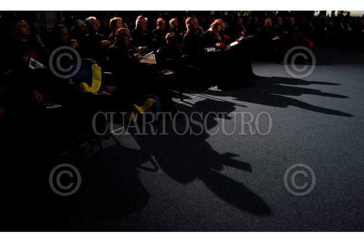 GUADALAJARA,JALISCO 11OCTUBRE2004.- Con una ceremonia de bienvenida en la Expo Guadalajara, continúan los trabajos del Congreso Eucarístico. Las sombras de varios cardenales y obispos se proyectan en el suelo. FOTO: Germán Romero/CUARTOSCURO.COM