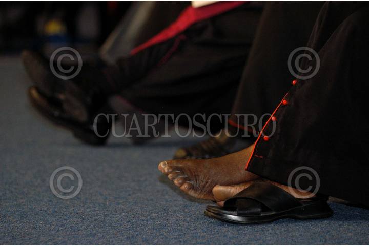 GUADALAJARA,JALISCO 11OCTUBRE2004.- Con una ceremonia de bienvenida en la Expo Guadalajara, continúan los trabajos del Congreso Eucarístico. Un religioso de África descansa sus pies durante el evento. FOTO: Germán Romero/CUARTOSCURO.COM