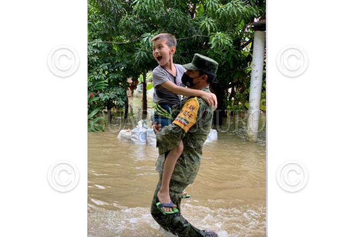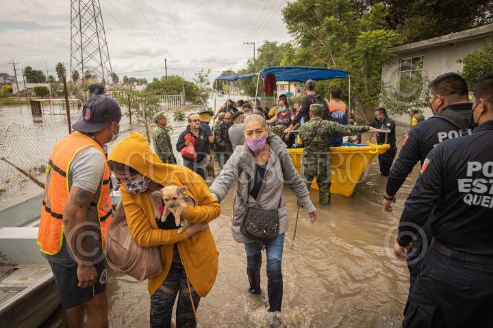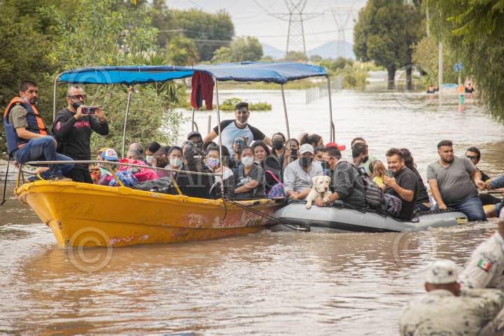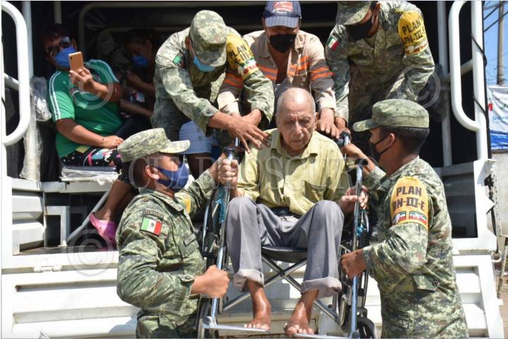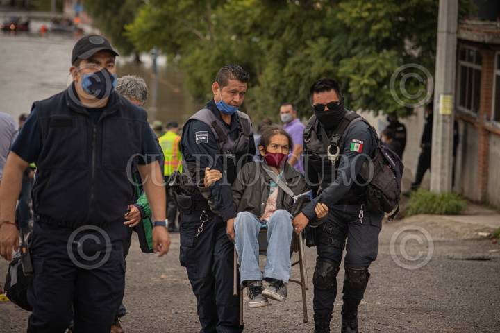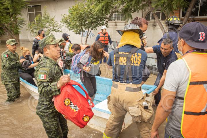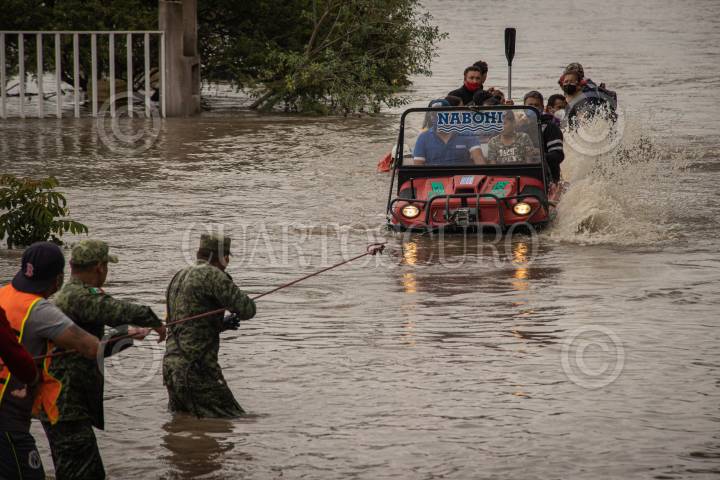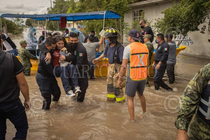 Soldados y personal de protección civil evacuaron a los habitantes del fraccionamiento La Rueda que se inundo con al menos metro y medio de agua esto tras las intensas lluvias.