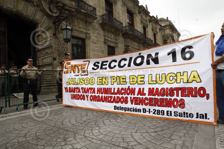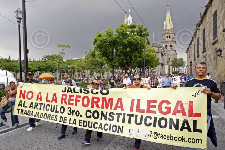 GUADALAJARA, JALISCO, 15JULIO2015.- Miles trabajadores docentes marcharon por las principales avenidas de la zona metropolitana, saliendo de la Plaza Juárez a Plaza de la Liberación y haciendo escalas en el PRI estatal, las instalaciones de una televisora, Gobierno del estado y finalizaron en el Congreso del Estado, esto con la finalidad de mostrar su inconformidad a ser evaluados como lo estipula la nueva Reforma Educativa. FOTO: FERNANDO CARRANZA GARCIA / CUARTOSCURO.COM