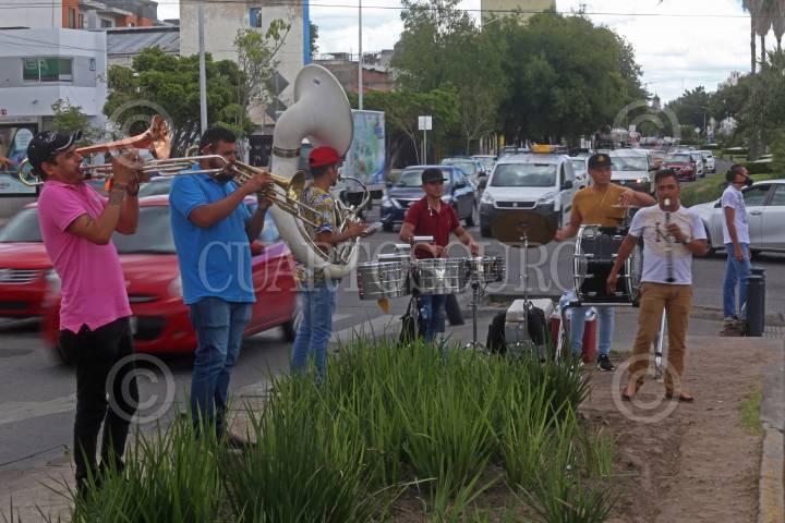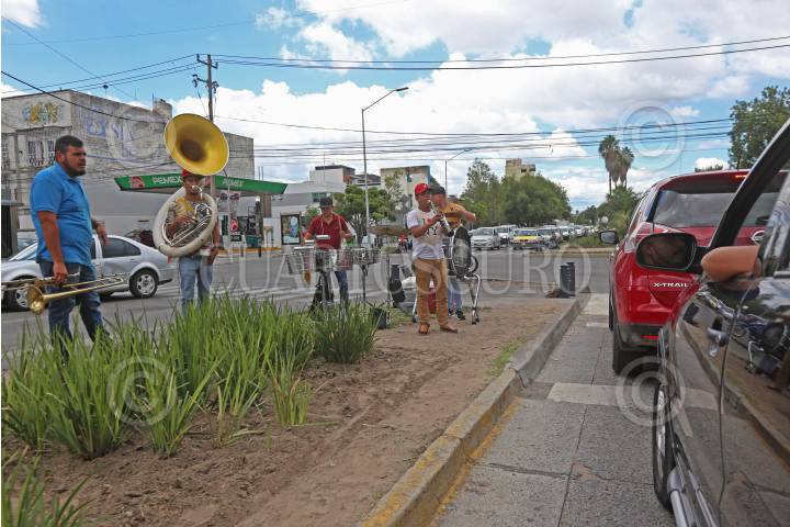 Músicos de la Banda Nueva Línea de Jalisco tocan sus instrumentos en los cruces de la avenida Alemania al cruce con Calzada Federalismo y ante la mirada de los automovilistas que paran por la luz roja, esto para generar recursos para poder subsistir a causa de la pandemia sanitaria del Covid-19.