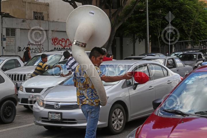 Un integrante de la Banda Nueva Línea de Jalisco pide el apoyo económico de los automovilistas que paran en avenida Alemania al cruce con Calzada Federalismo por la luz roja, esto para generar recursos para poder subsistir a causa de la pandemia sanitaria del Covid-19.