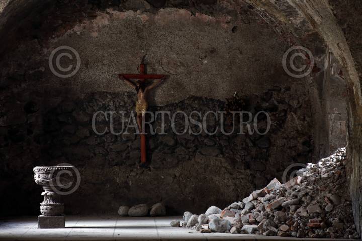 VILLA DE AYALA, MORELOS, 28JUNIO2018.-Un crucifijo en la pared y una pila bautismal en un rincón de la Ex Hacienda de Coahuixtla. Esta construcción centenaria funciono como una gran fábrica de azúcar en el periodo pre revolucionario. FOTO: MARGARITO PÉREZ RETANA /CUARTOSCURO.COM