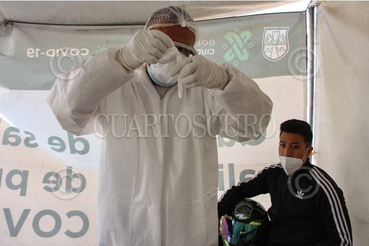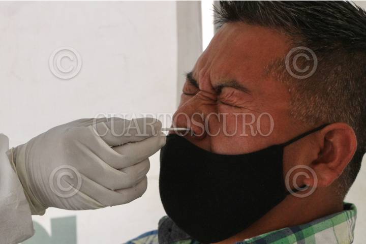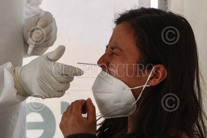 Una mujer durante proceso de toma de muestra nasal, para la detección de COVID-19.