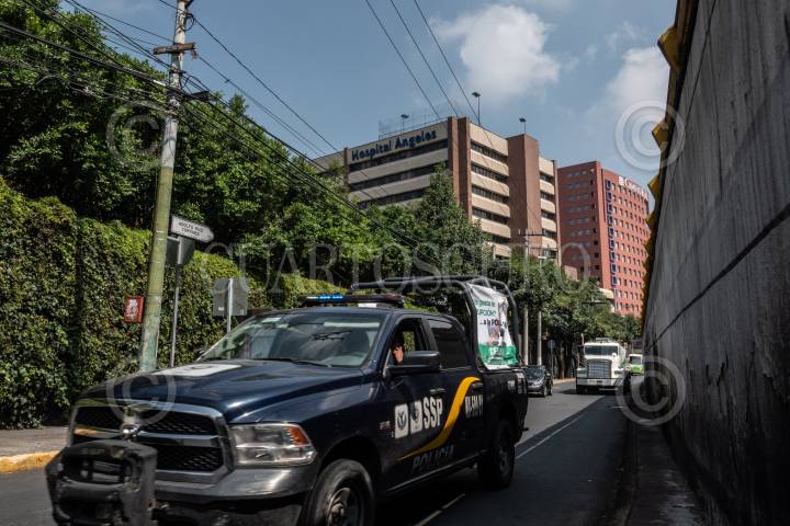 Elementos de la Gaurdia Nacional y de Seguridad Pública mantiene discret operativo en las inmediaciones del Hospital Ángeles, donde se encuentra internado Emilo Lozoya, ex director de Pemex