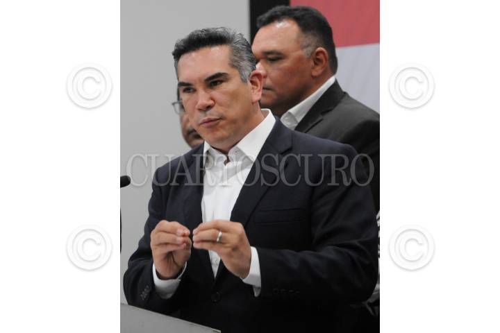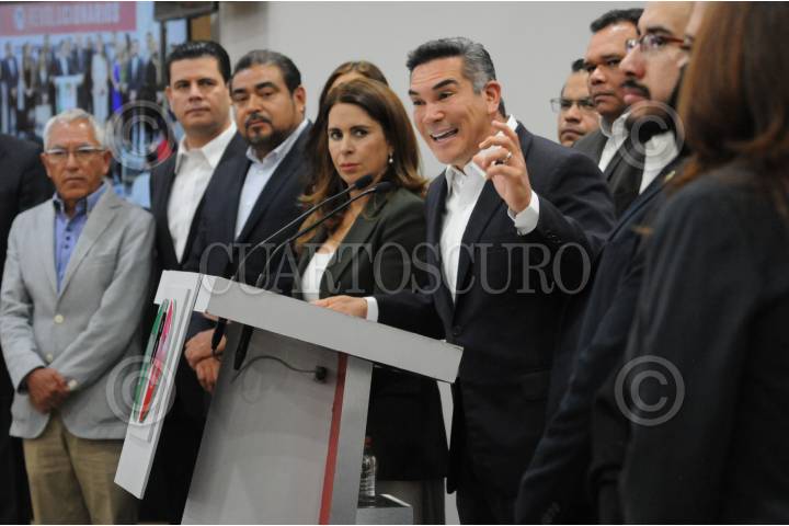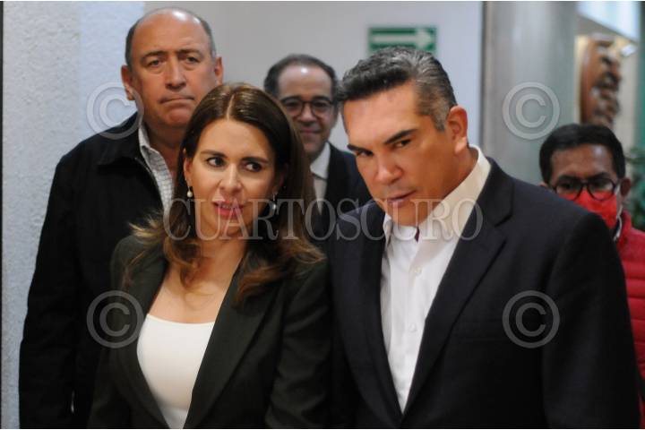 Los ex gobernadores Alfredo Baranda y César Camacho Quiroz durante el registro de Alejandra del Moral como candidata de la coalición “Va por el Estado de México”.