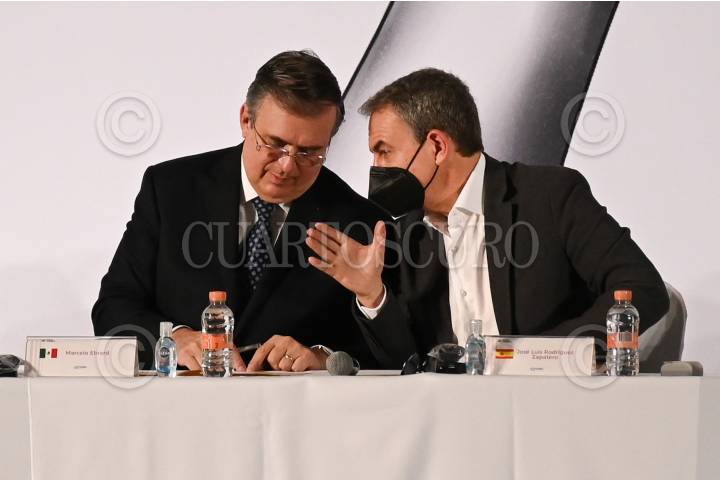 Marcelo Ebrard, canciller mexicano y José Luis Rodriguez Zapatero, ex presidente de España, dialogan durante el evento.