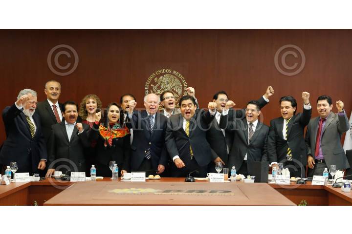 MÉXICO, D.F., 19NOVIEMBRE2015.- Los senadores del PRD se reunieron con el Dr. José Ramón Narro Robles, ex rector de la UNAM. Al final del encuentro los legisladores y el Dr. Narro entonaron un goya, la tradicional porra universitaria. FOTO: CUARTOSCURO.COM