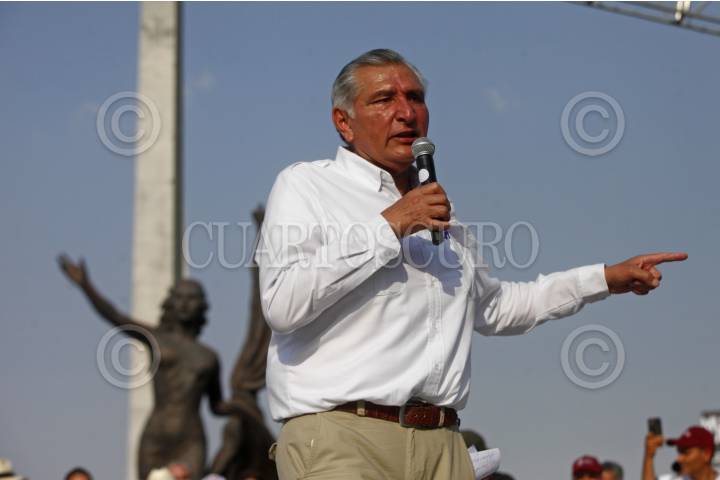 Adán Augusto López Hernández durante su intervención en la Plaza de la Republica, donde encabezo una Asamblea Informativa.