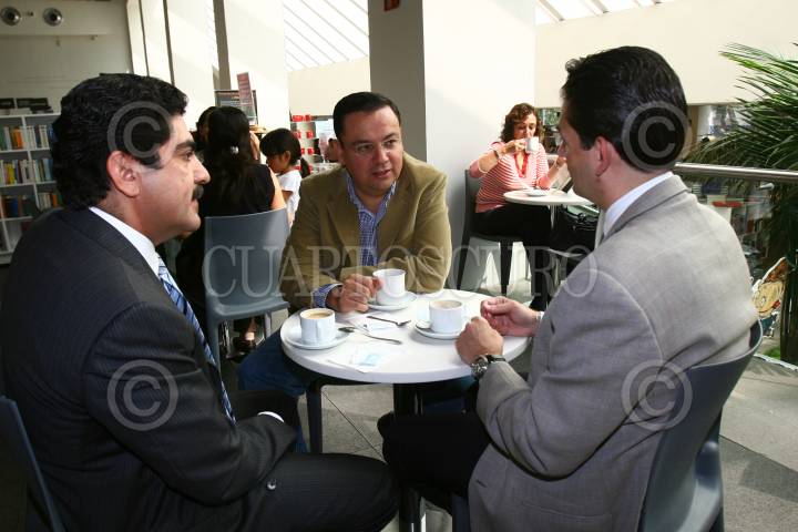 MÉXICO, D.F., 25JULIO2008.- Manuel Espino, ex-dirigente del PAN, Germán Martínez Cazares, presidente nacional del PAN y Juan Camilo Mouriño, Secretario de Gobernación, durante un desayuno en un cafetería-librería de la colonia Condesa. FOTO: MOISÉS PABLO/CUARTOSCURO.COM