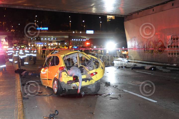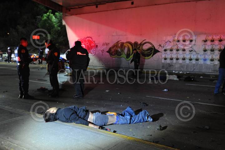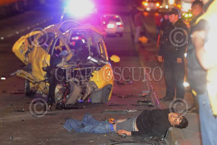 MÉXICO D.F; 16FEBRERO2014.- Cuatro Jóvenes pierden la vida, al impactar el auto Seat en el que viajaban contra la barra de contención y la base de un puente en Circuito Interior, en la parte baja del puente de Los Leones en la entrada al Bosque de Chapultepec. FOTO: LUIS CARBAYO /CUARTOSCURO.COM
