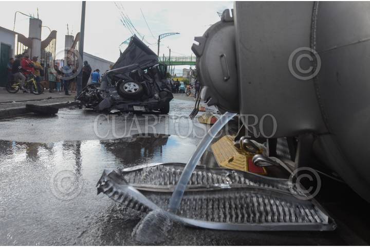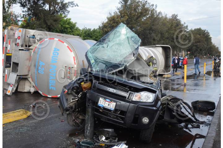 La pipa de agua aplastó un automovil al caer dando luego de girar sobre una curva a exceso de velocidad.