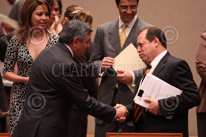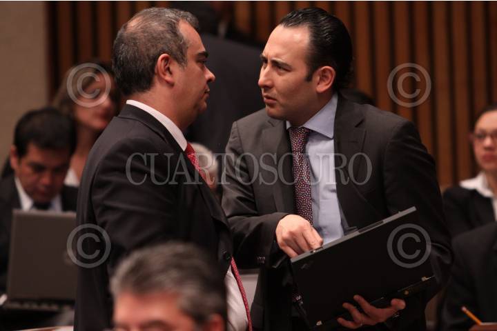 MÉXICO D.F., 24MARZO2009.- Alfredo Figueroa Fernández, consejero y Roberto Gil Zuarth, representante panista, durante la sesión extraordinaria en la cual se discutió el dictamen modificado que reduce casi a la mitad la multa originalmente aplicada a Televisión Azteca y TV Azteca –dos razones sociales de la televisora del Ajusco– con 4 millones de pesos. En este nuevo dictamen se eliminó, entre otros aspectos, el carácter de reincidente en la comisión de irregularidades relacionadas con la transmisión de espots electorales. FOTO: MOISÉS PABLO/CUARTOSCURO.COM