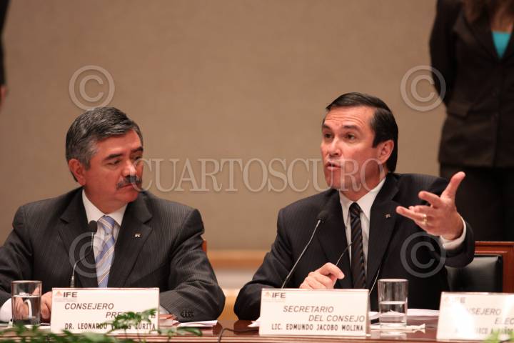 MÉXICO D.F., 24MARZO2009.- Leonardo Valdésd Zurita, Consejero Presidente del IFE y Edmundo jacobo Molina, secretario ejecutivo, durante la sesión extraordinaria en la cual se discutió el dictamen modificado que reduce casi a la mitad la multa originalmente aplicada a Televisión Azteca y TV Azteca –dos razones sociales de la televisora del Ajusco– con 4 millones de pesos. En este nuevo dictamen se eliminó, entre otros aspectos, el carácter de reincidente en la comisión de irregularidades relacionadas con la transmisión de espots electorales. FOTO: MOISÉS PABLO/CUARTOSCURO.COM