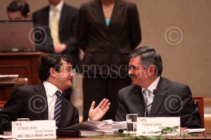 MÉXICO D.F., 24MARZO2009.- Virgilio Andrade Martínez, consejero y Leonaro Valdés Zurita, presidente consejero del IFE, durante la sesión extraordinaria en la cual se discutió el dictamen modificado que reduce casi a la mitad la multa originalmente aplicada a Televisión Azteca y TV Azteca –dos razones sociales de la televisora del Ajusco– con 4 millones de pesos. En este nuevo dictamen se eliminó, entre otros aspectos, el carácter de reincidente en la comisión de irregularidades relacionadas con la transmisión de espots electorales. FOTO: MOISÉS PABLO/CUARTOSCURO.COM