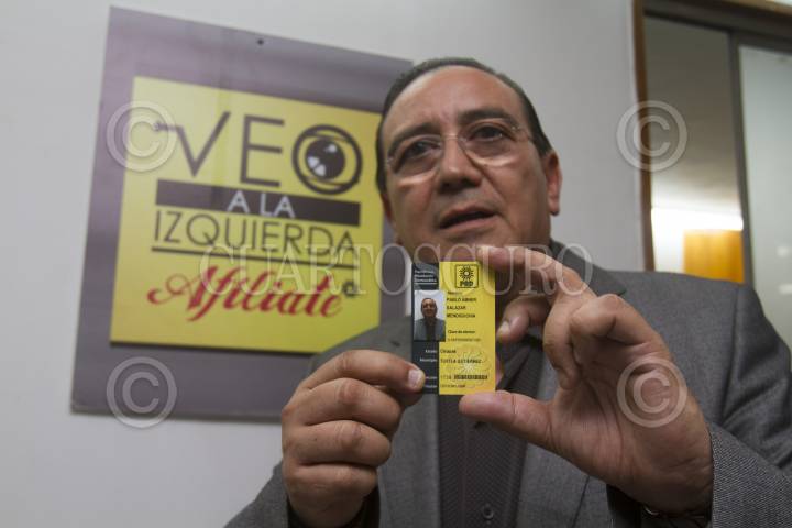 MÉXICO, D.F., 07AGOSTO2013.- Pablo Abner Salazar Mendiguchia, exgobernador de Chiapas, quien estuviera preso por más de un año se afilió hoy al Partido de la Revolución Democrática (PRD) tras 14 años de lo que denominó "un ayuno partidista". Durante el proceso de afiliación, el exmandatario chiapaneco fue registrado erroneamente como originario de la Delegación Coyoacán en el D.F., después de la conferencia de prensa fué rectificada la credencial de afiliación del Sol Azteca. Fué acompañado por Gilberto Ensástiga, exdelegado en Tláhuac, y Carlos Sotelo, precandidato a la dirigencia nacional del PRD. FOTO: JUAN PABLO ZAMORA /CUARTOSCURO.COM
