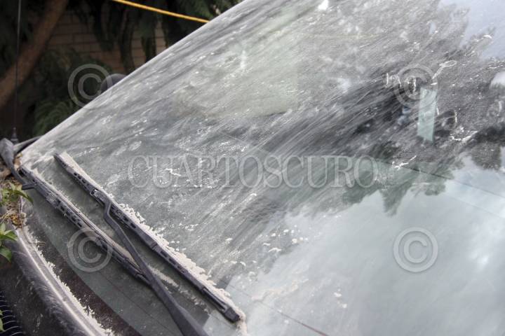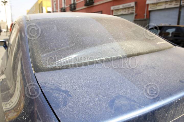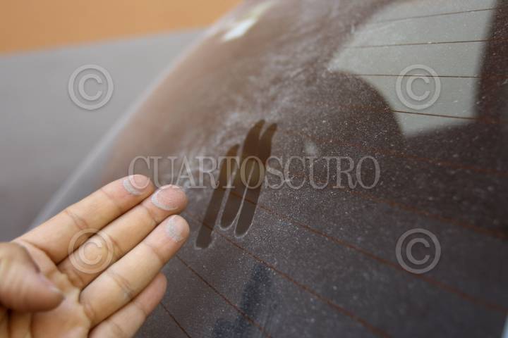 PUEBLA, PUEBLA, 17ABRIL2012.- Detalle de ceniza volcánica en los autos después de que la madrugada de ayer el volcán Popocatépetl realizara continuas exhalaciones; el semáforo de alerta volcánica pasó a amarillo fase 3. FOTO: HILDA RÍOS /CUARTOSCURO.COM
