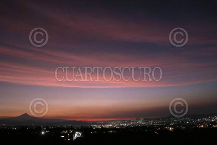 El volcán Popocatepetl arroja una exhalación de gases, agua y vapor durante el amanecer de este dia, imagen tomada desde Cuernavaca.
