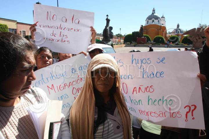TLAXCALA, TLAXCALA, 25OCTUBRE2011.- Integrantes de la Asamblea Popular de Familias Migrantes (APOFAM) se observan durante una protesta pacífica que llevaron a cabo frente a la sede del congreso local. La APOFAM, que agrupa a familias migrantes de una docena de municipios del estado se manifestó en contra de las modificaciones a la Ley de protección a Migrantes de Tlaxcala, en la que se plantea eliminar los fondos municipales para antención al migrante asi como se pretende desaparecer el Consejo Estatal de atención a Migrantes. Debido a que personal de seguridad cerró los accesos del recinto legislativo, se retrasó el inicio de la sesión de congreso local por espacio de un par de horas. FOTO: J. GUADALUPE PÉREZ/CUARTOSCURO.COM