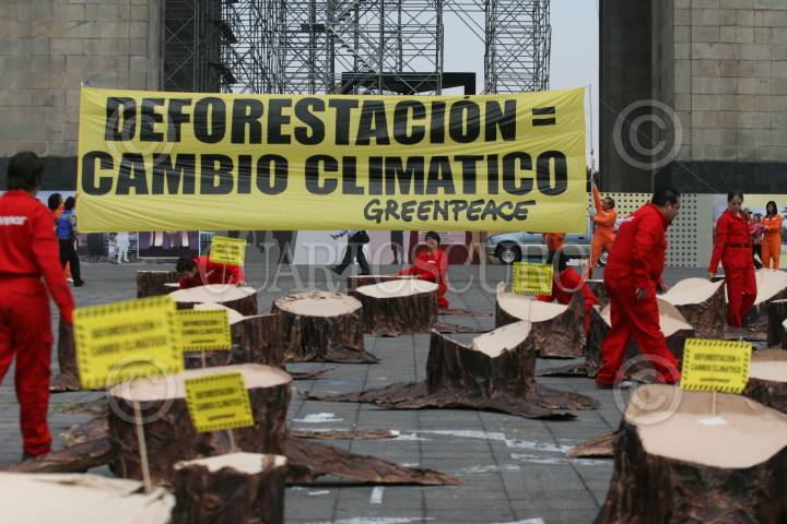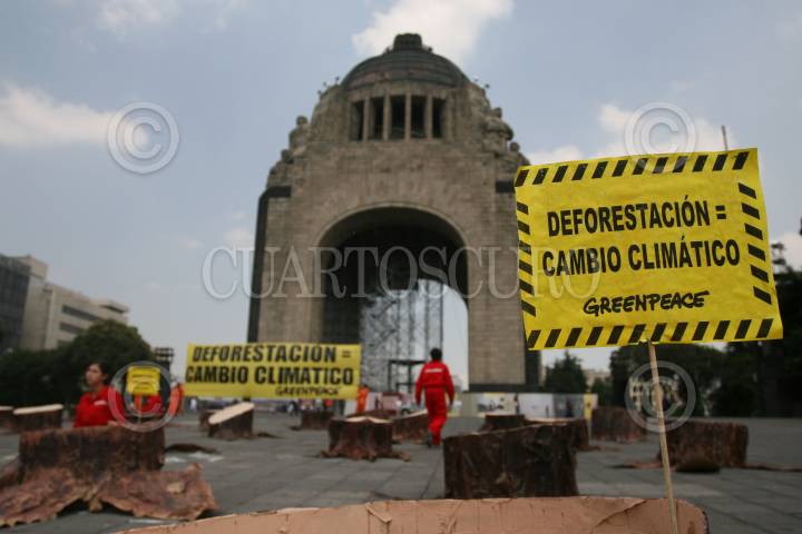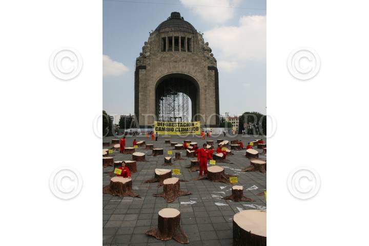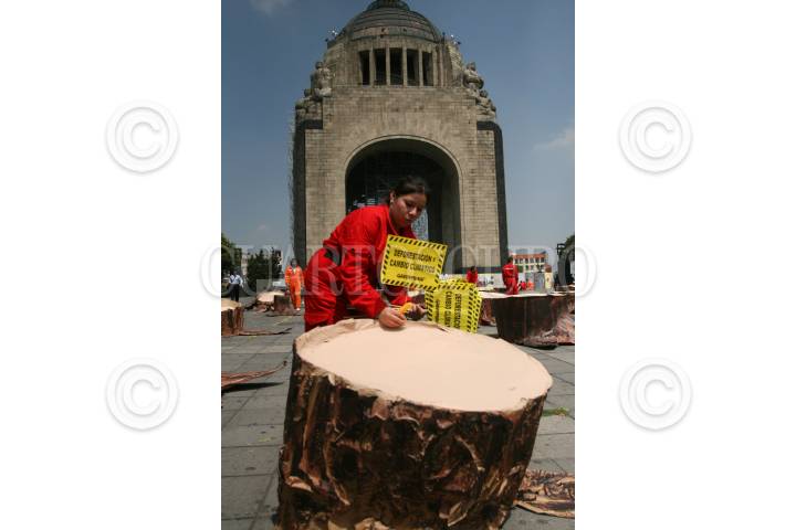 MÉXICO D.F., 09JULIO2009.- Colocando 80 tacones de árboles en la explana del Monumento a la Revolución, integrantes de Green Peace, se manifestaron por la perdida de bosques y selvas lo cual significa perdida de masa forestal en México, esto dentro del marco del “Día del Árbol”. FOTO: GUILLERMO PEREA/CUARTOSCURO.COM