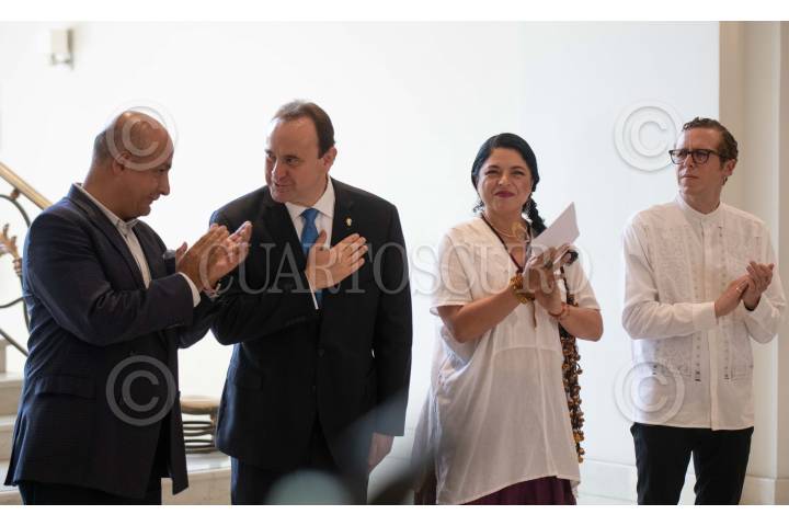 Alejandra Frausto Guerrero, secretaria de Cultura; Marco Tulio Chicas, embajador de Guatemala en México; Maximiliano Reyes Zúñiga, Subsecretario para América Latina y el Caribe, y Homero Fernández, director del Complejo Cultural Los Pinos, encabezaron en la Casa Miguel Alemán, la inauguración de la exposición y venta "Guatemala en Los Pinos".