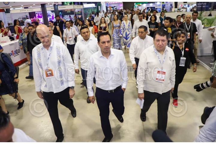 MÉRIDA, YUCATÁN, 09JULIO2024.- Ricard Zapatero, director de Negocio Internacional de Fira de Barcelona; Mauricio Vila Dosal, gobernador de Yucatán, y Manuel Redondo, presidente de Prunus, recorren el Smart City Expo LATAM Congress 2024, que se realizará del 09 al 11 de julio, en el Centro de Convenciones Yucatán Siglo XXI. FOTO: MARTIN ZETINA/CUARTOSCURO.COM