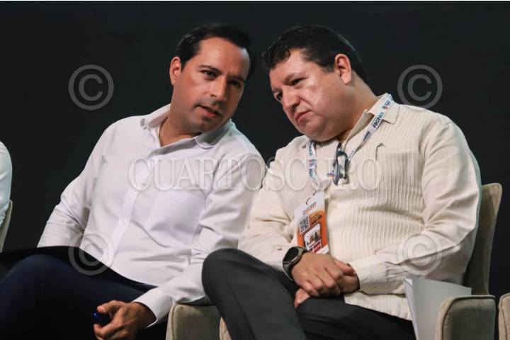 MÉRIDA, YUCATÁN, 09JULIO2024.- Mauricio Vila Dosal, gobernador de Yucatán, y Manuel Redondo, presidente de Prunus, conversan durante el acto protocolario de inauguración del Smart City Expo LATAM Congress 2024, que se realizará del 09 al 11 de julio, en el Centro de Convenciones Yucatán Siglo XXI. FOTO: MARTIN ZETINA/CUARTOSCURO.COM