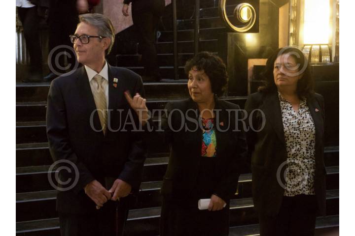 CIUDAD DE MÉXICO, 04SEPTIEMBRE2019.- Alfonso Suárez del Real, secretario de cultura de la ciudad; Lucina Jiménez, Directora General del Instituto Nacional de Bellas Artes y Literatura y Florencia Serrania, Directora del Sistema de Transporte Colectivo Metro, encabezaron la inauguración de la exposición, Metro 50 años, en el Palacio de Bellas artes. FOTO: ROGELIO MORALES /CUARTOSCURO.COM