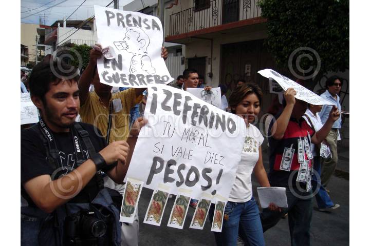 CHILPANCINGO, GUERRERO., 19OCTUBRE2007.-Periodistas realizaron un marcha por las principales calles de la ciudad capital, en apoyo a cinco de sus compañeros reporteros que trabajan para un periodico estatal, luego de que fueran demandados por Alberto Torreblanca Galindo hermano del gobernador del estado Zeferino Torreblanca Galindo, quien pide alrededor de 10 millones de pesos por daño moral, exigiendo los periodistas respeto a la libertad de expresion. FOTO: OSCAR ALVARADO/CUARTOSCURO.COM