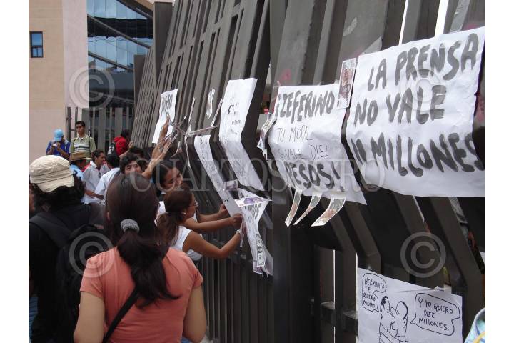 OAXACA, OAXACA, 11JUNIO2010.- Luego de los hechos ocurridos ayer durante un enfrentamiento en ciudad universitaria en el que resultara lesionada la periodista Ixtlí Martínez, corresponsal de MVS, periodistas se dieron cita pancartas en mano en las instalaciones de la procuraduría de justicia del estado para exigir se esclarezcan los hechos y respeto a la libertad de expresión. FOTO: MAX NÚÑEZ/CUARTOSCURO.COM
