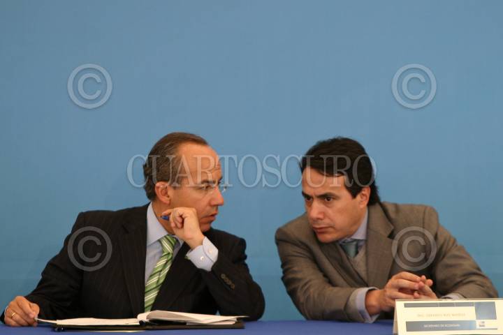 MÉXICO, D.F., 04FEBRERO2009.- El presidente Felipe Calderón conversa con Gerardo Ruiz Mateos secretario de Economía durante el acto inaugural del Centro de Excelencia American Express ubicado en Tecnopaque. FOTO: RODOLFO ANGULO/CUARTOSCURO.COM