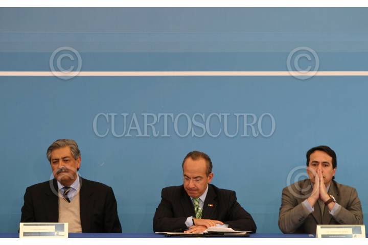 MÉXICO, D.F., 04FEBRERO2009.- Rodolfo Elizondo, secretario de Turismo, el presidente Felipe Calderón y Gerardo Ruiz Mateos secretario de Economía durante el acto inaugural del Centro de Excelencia American Express ubicado en Tecnopaque. FOTO: RODOLFO ANGULO/CUARTOSCURO.COM