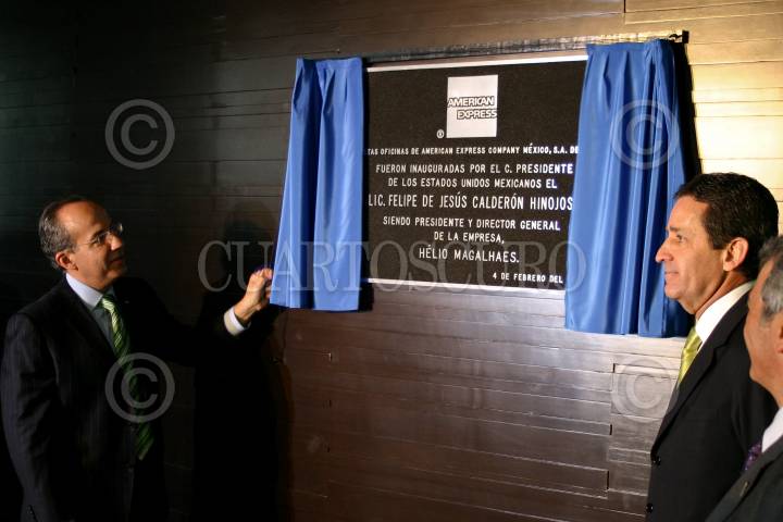 MÉXICO, D.F., 04FEBRERO2009.- El presidente Felipe Calderón acompañado de Helio Magalhares, presidente y director general de American Express México durante la develación de una placa en el acto inaugural del Centro de Excelencia American Express ubicado en Tecnopaque. FOTO: RODOLFO ANGULO/CUARTOSCURO.COM