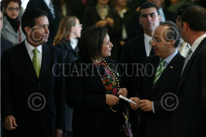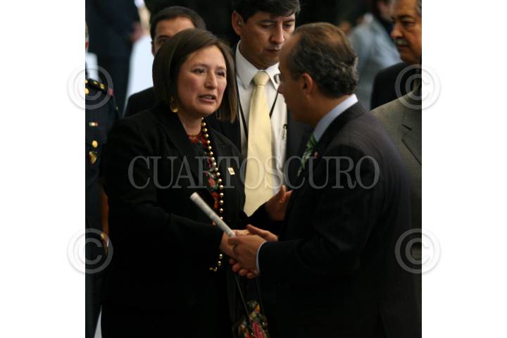 MÉXICO, D.F., 04FEBRERO2009.- Xóchitl Gálvez Ruiz, ex Comisionada Nacional para el Desarrollo de los Pueblos Indígenas conversa con el presidente Felipe Calderón al termino del recorrido por el Centro de Excelencia American Express que se ubica en Tecnopaque. FOTO: RODOLFO ANGULO/CUARTOSCURO.COM