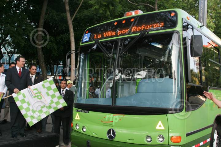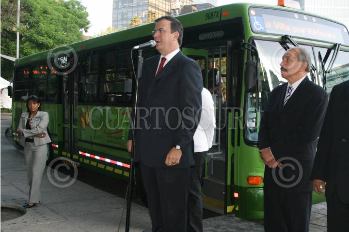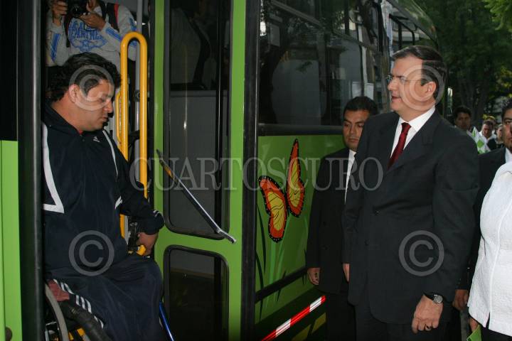 MÉXICO, D.F., 08JUNIO2009.- Marcelo Ebrad jefe de gobierno capitalino, dio el banderazo de salida a 145 nuevas unidades de la Red de Transporte de Pasajeros (RTP) que recorrerá 11 rutas con paradas estratégicas en corredores principales de la Ciudad de México y beneficiará a alrededor de 95 mil usuarios por semana. FOTO: RICARDO CASTELAN/CUARTOSCURO.COM
