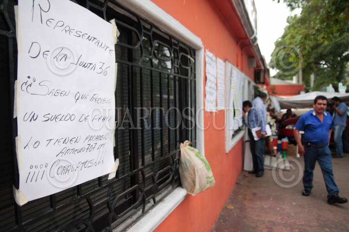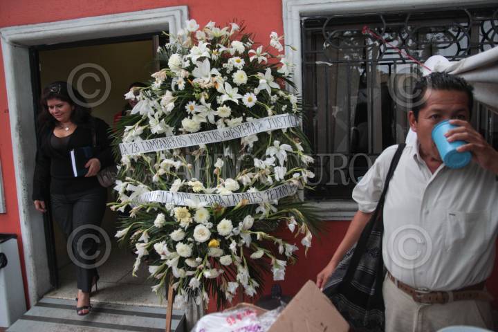 VILLAHERMOSA, TABASCO, 05FEBRERO2010.- El conflicto entre ex-petroleros con la Junta Federal de Conciliación y Arbitraje (JFCA) continua en este tercer día, donde más de un centenar y medio de estos ex trabajadores del municipio de Paraiso tienen tomadas y bloqueadas de manera pacifica las instalaciones del edificio que se ubica sobre Paseo Tabasco en la colonia El Aguila. En esta ocasión pusieron una ofrenda floral donde indica de la muerte en "28 compañeros fallecidos por esperar sean reinstalados en sus puestos petroleros"; así mismo indican que el laudo laboral les favorece pero las autoridades laborales del fuero federal se niegan acatar la resolucion. FOTO: MARCO POLO GUZMÁN HERNÁNDEZ/CUARTOSCURO.COM