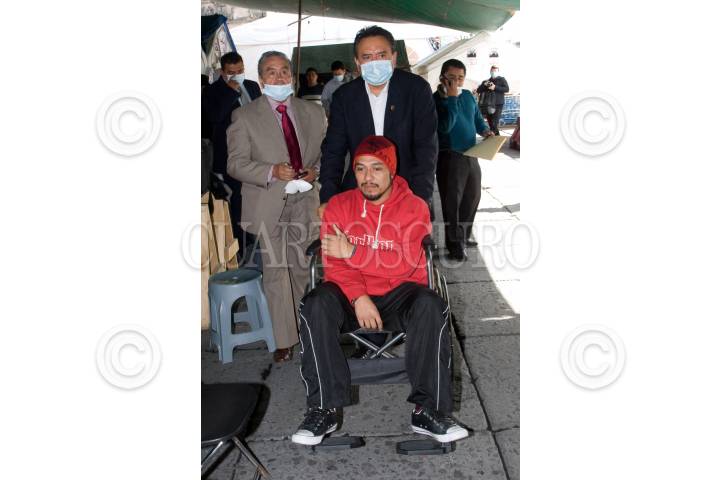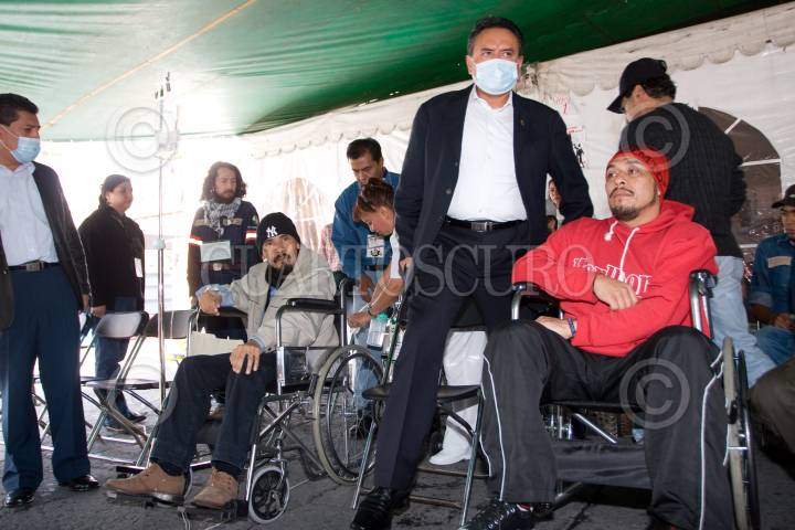 MÉXICO D.F., 19JULIO2010.- Martín Esparza, Dirigente de SME, quien lleva en silla de ruedas a Miguel Ibarra uno de los extrabajadores de la extinta Compañía de Luz y Fuerza del Centro, que se mantiene en huelga de hambre, sufrió un desmayo luego de más de 80 días de no tomar alimentos, esto durante la lectura a un comunicado donde solicitan que sean recibidos por el representante del ejecutivo y donde se señaló al gobierno federal como responsable de lo que le pueda suceder a sus compañeros en huelga de hambre. FOTO: GUILLERMO PEREA/CUARTOSCURO.COM