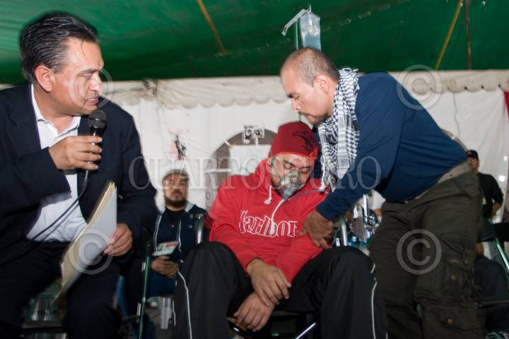 MÉXICO D.F., 19JULIO2010.- Miguel Ibarra uno de los extrabajadores de la extinta Compañía de Luz y Fuerza del Centro, que se mantiene en huelga de hambre, sufrió un desmayo luego de más de 80 días de no tomar alimentos, esto durante la lectura a un comunicado donde solicitan que sean recibidos por el representante del ejecutivo y donde se señaló al gobierno federal como responsable de lo que le pueda suceder a sus compañeros en huelga de hambre. FOTO: GUILLERMO PEREA/CUARTOSCURO.COM