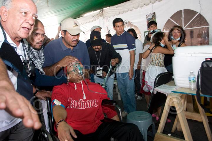 MÉXICO D.F., 19JULIO2010.- Miguel Ángel Ibarra uno de los extrabajadores de la extinta Compañía de Luz y Fuerza del Centro, que se mantiene en huelga de hambre, sufrió un desmayo luego de más de 80 días de no tomar alimentos, esto durante la lectura a un comunicado donde solicitan que sean recibidos por el representante del ejecutivo y donde se señaló al gobierno federal como responsable de lo que le pueda suceder a sus compañeros en huelga de hambre. FOTO: GUILLERMO PEREA/CUARTOSCURO.COM