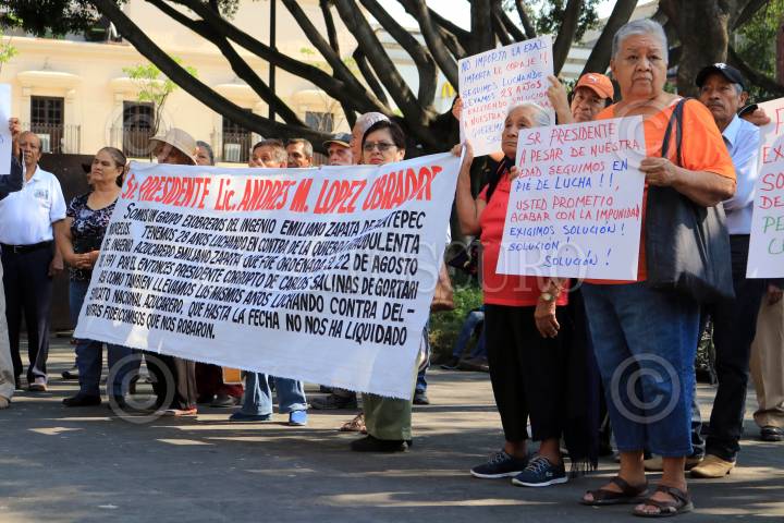 CUERNAVACA, MORELOS, 08ABRIL2019.- Un grupo de extrabajadores del Ingenio Emiliano Zapata de Zacatepec se manifiesta en la plaza de armas de la capital. Los extrabajadores compraron hace 28 años bonos y exigen que les sean pagados, según su representante legal cada bono equivale a 500 mil pesos. FOTO: MARGARITO PÉREZ RETANA /CUARTOSCURO.COM