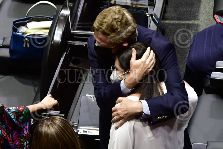 Juan Carlos Romero Hicks, diputado y coordinador del PAN, abraza a su compañera de bancada Patricia Terrazas, durante durante la sesión extraordinaria de la Cámara de Diputados en la que se discute el aplazamiento de la entrada en vigor de la reforma en materia de subcontratación laboral.