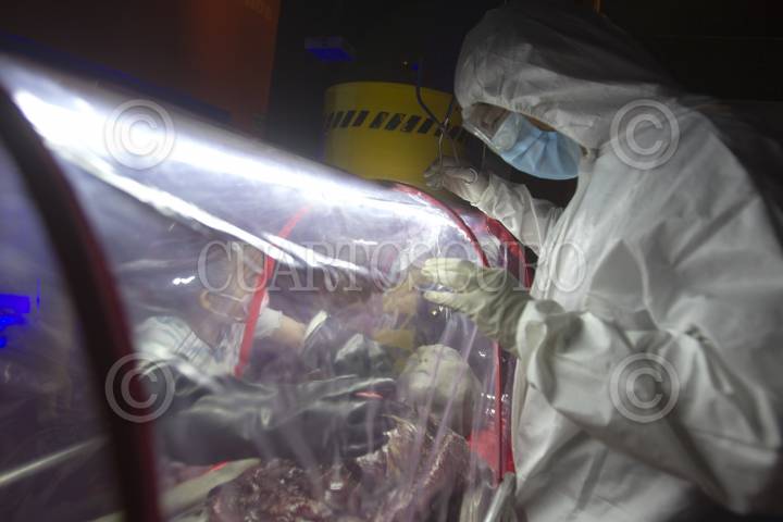 Dentro de la primera edición de Expo Ovni; Un "doctor" examina a un "extraterrestre" en la sala de operaciones.