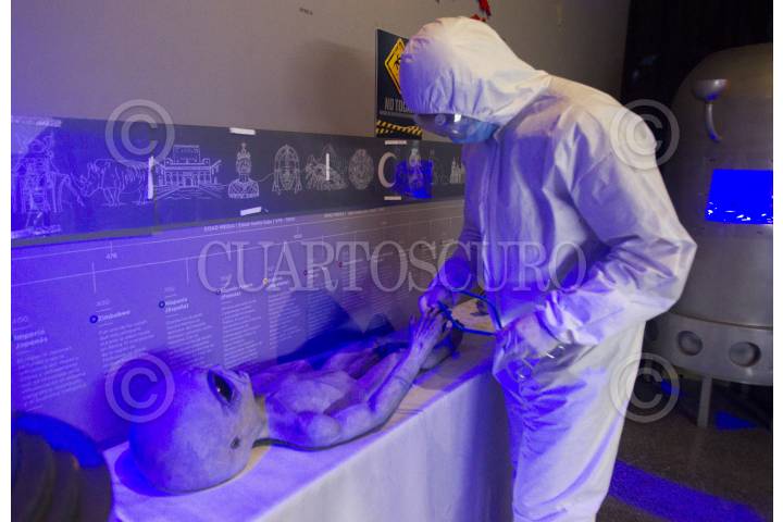 Dentro de la exhibición de Expo Ovni; un "doctor" supervisa a los visitantes del museo.