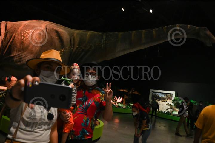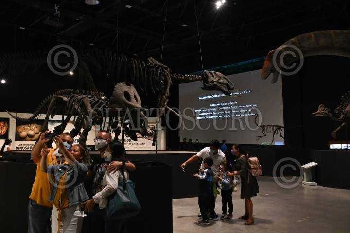 Dos familias se toman fotografías con los fósiles de dinosaurios expuestos.
