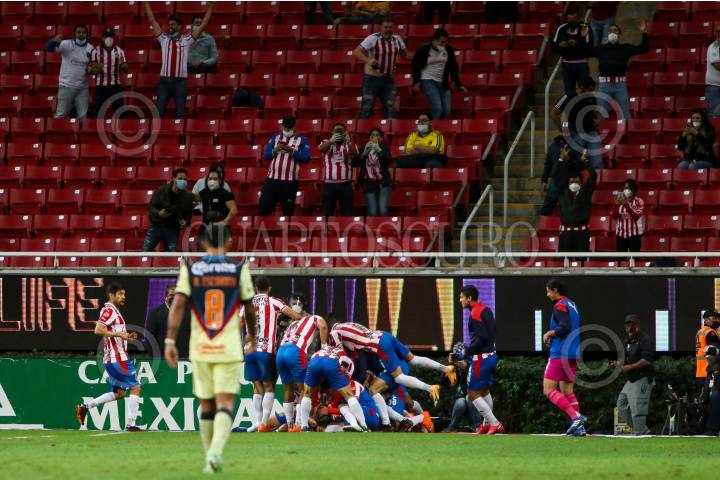 Las Chivas del Guadalajara celebran el gol de Cristian Calderón con el cual logaron la victoria por la mínima al América.